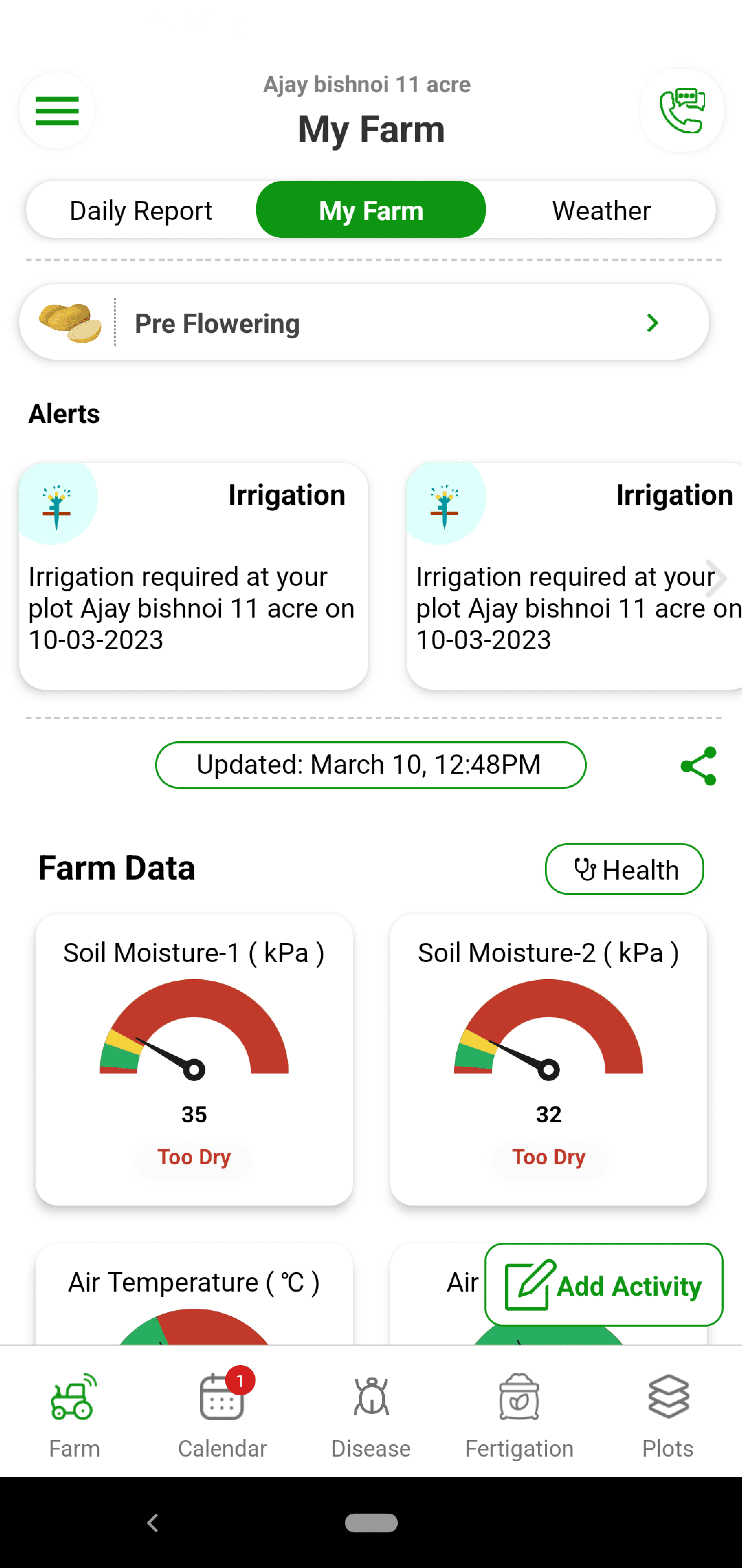 Too much water or too less water can be very harmful for potato. Over irrigation leads to wilting in the plants. Keeping soil aerated is very important for potato growing. Potato’s water requirements vary based on soil type and stage. With Fyllo’s device containing soil moisture and soil temperature sensor and intelligent software, you get alerts on how much water to provide to the crop. You can also see and visualize evapotranspiration (Etc) values of the crop. You can perfectly manage the water requirements to get the perfect size, color and sugar.